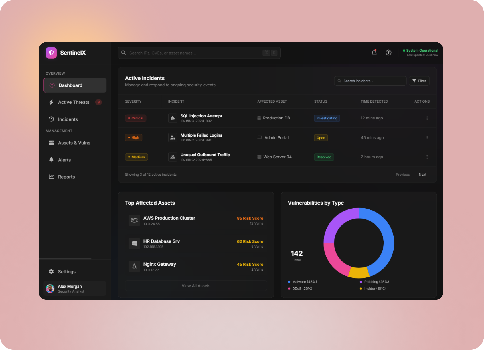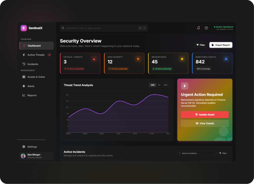 SentinelX introduces a severity-first security dashboard designed to reduce cognitive load and help teams act quickly during active incidents.